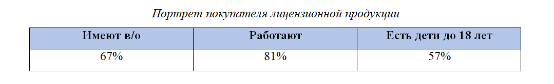 Портрет типичного потребителя лицензионной продукции (кидалта) в России – это экономически активный человек примерно 39 лет с высшим образованием и средним личным доходом около 78,5 тысяч рублей в месяц: 67% – женщины и 33% – мужчины. Как правило, они имеют высшее образование, работают, и у них есть несовершеннолетние дети.