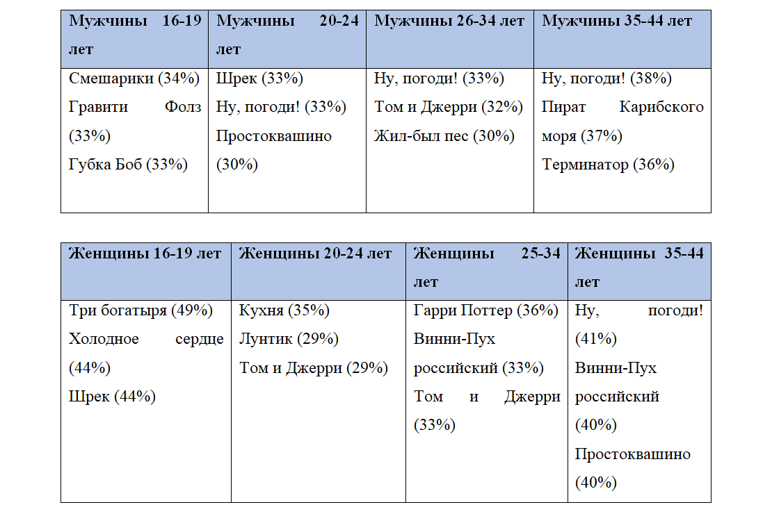 Предпочтения в лицензионных героях у кидалтов различаются в зависимости от пола и возраста. Среди мужчин популярны «Смешарики», «Шрек» и «Ну, погоди!», а среди женщин – «Три богатыря», «Гарри Поттер» и «Ну, погоди!».