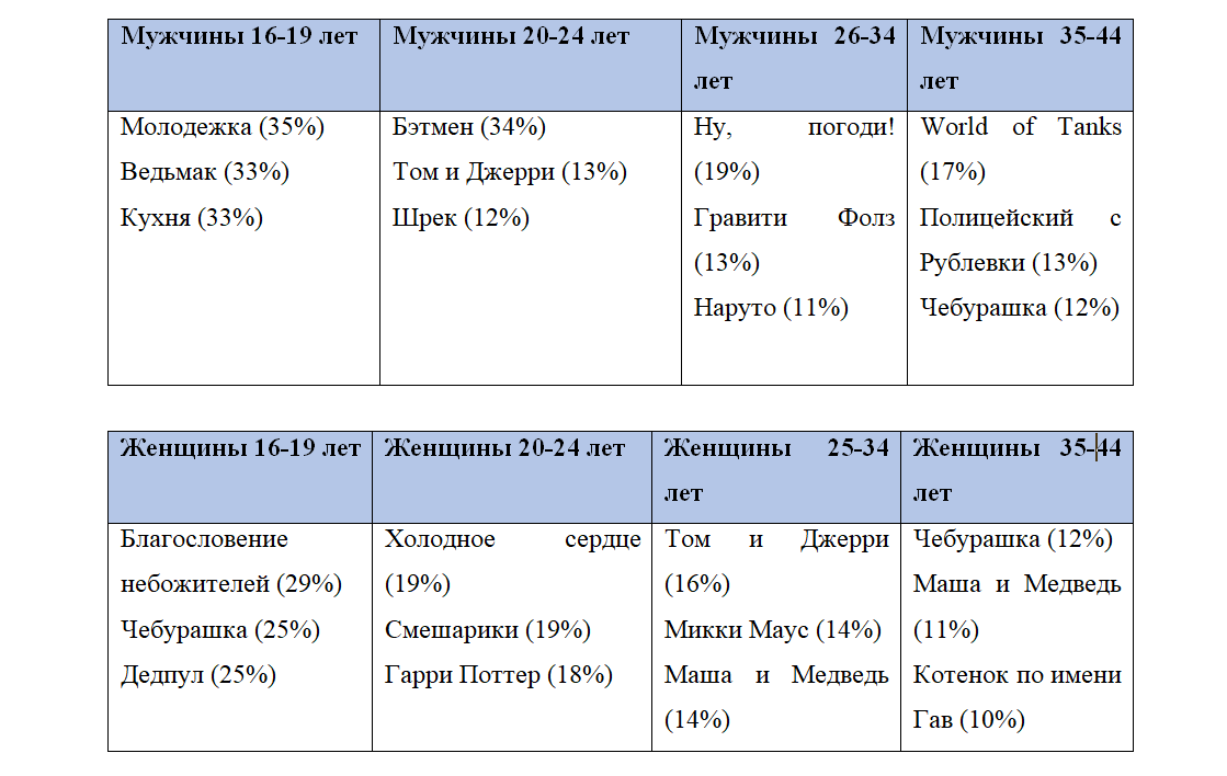 При этом реальные покупки за последние полгода включали товары с самыми разными персонажами: от Бэтмена и «Мира Танков» у мужчин до «Благословения небожителей» и Чебурашки у женщин.