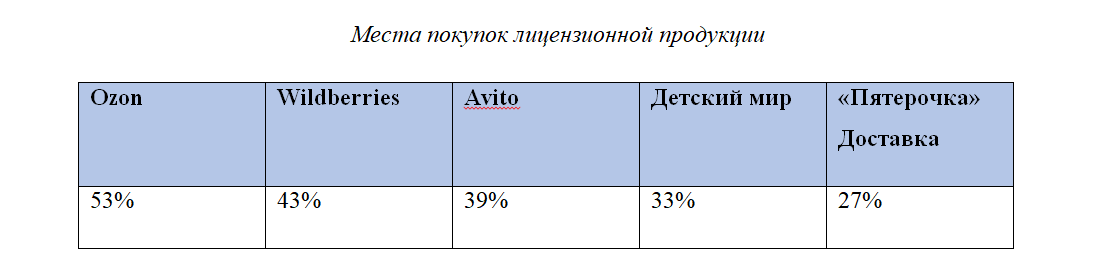 Каждая вторая мама, имеющая детей от 4 до 15 лет, покупает товары с лицензионными героями на маркетплейсах. Мамы детей 4-6 лет чаще покупают лицензионные товары в супермаркете/гипермаркете – их доля составляет 45%.