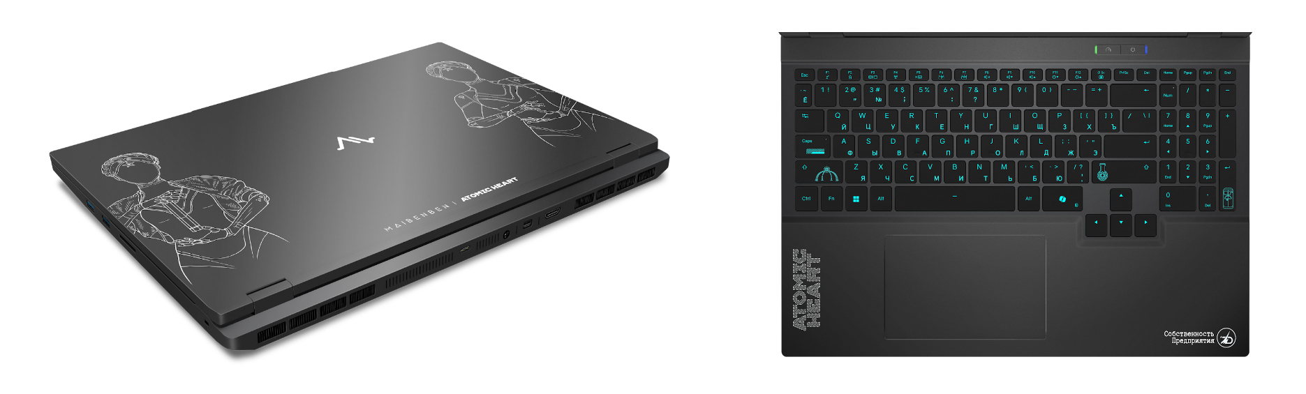 Корпус ноутбука – темно-серый, выполнен из алюминия и его вес составляет 2,1 кг. На верхней крышке расположены логотипы MAIBEBEN и Atomic Heart, а по бокам одни из самых узнаваемых героев игры – Близняшки. Рабочая поверхность устройства также стилизована: слева от тачпада выгравирован логотип Atomic Heart, а на клавишах клавиатуры размещены элементы из игры. В комплекте с ноутбуком идет мышь ограниченной серии и полноразмерный коврик с портретами главных персонажей.