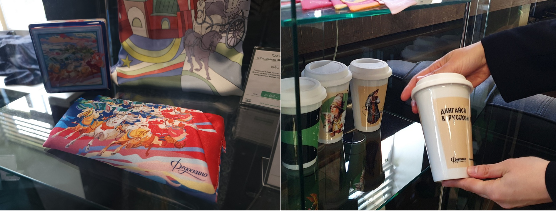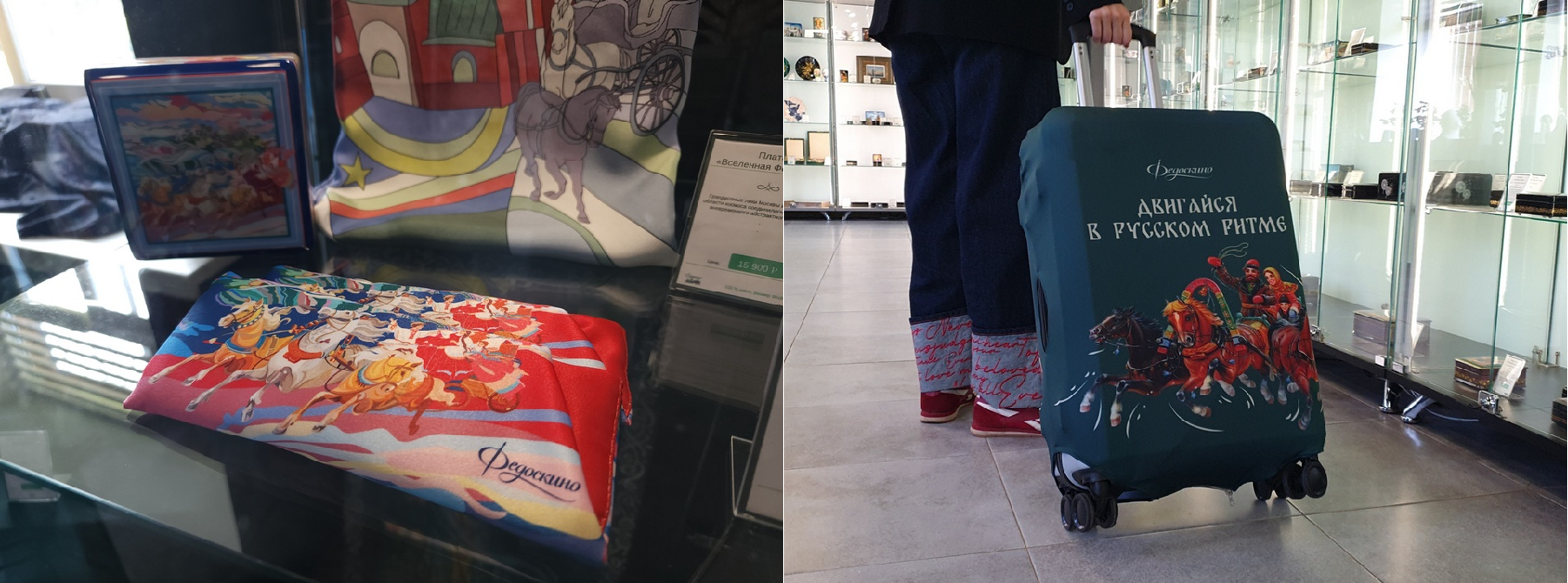 Жители и гости округа могут приобрести сувениры в подарок близким и приятные вещи для себя в стиле знаменитой федоскинской миниатюры. Это зеркала, чехлы на наушники и обложки на паспорта, стикеры, платки и даже чехол для чемодана.