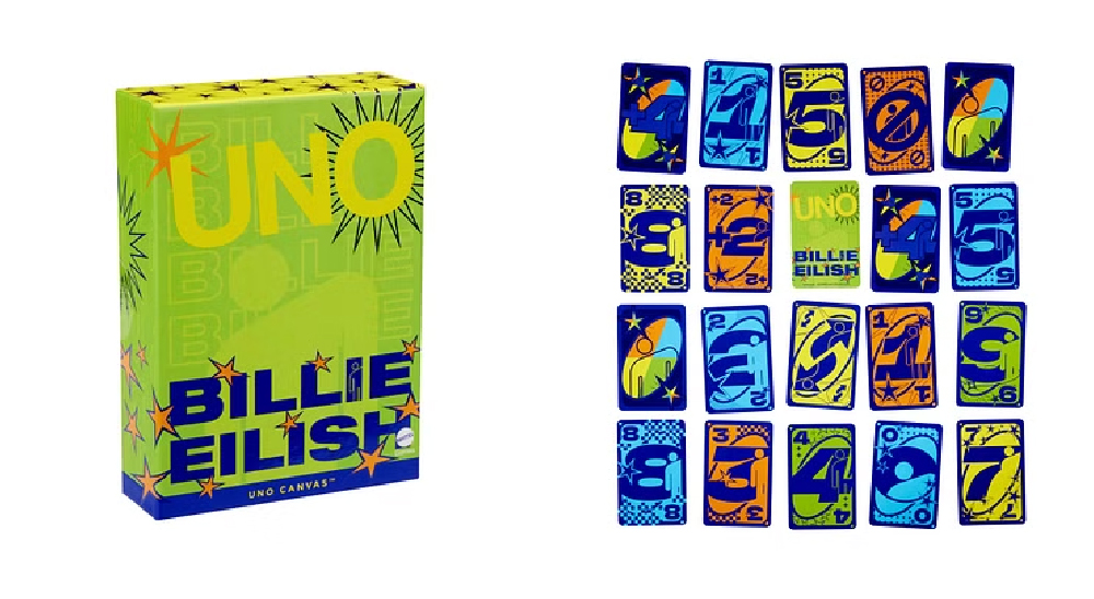 Американская певица Билли Айлиш представила лимитированную версию популярной настольной игры Uno, выполненную в фирменной зелено-синей гамме и украшенную ее знаменитым логотипом Blohsh.