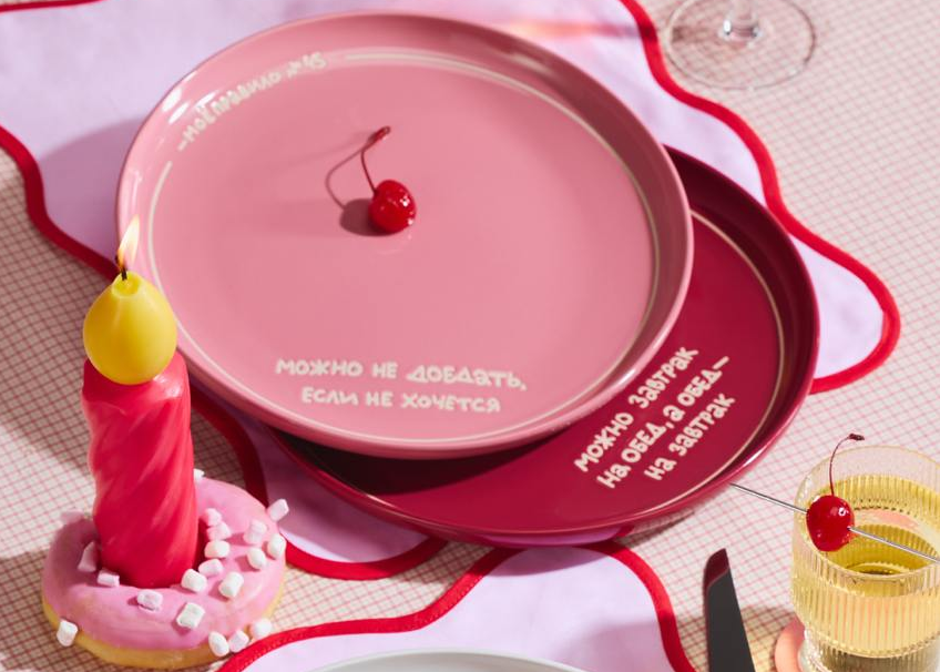 Оригинальные свечи выпущены в трех ароматах: малина, лимонный пирог и персик. Дополняют линейку три тарелочки с ироничными фразами: «Можно завтрак на обед, а обед – на завтрак», «Можно не доедать, если не хочется», «Кто готовит, тот не моет».