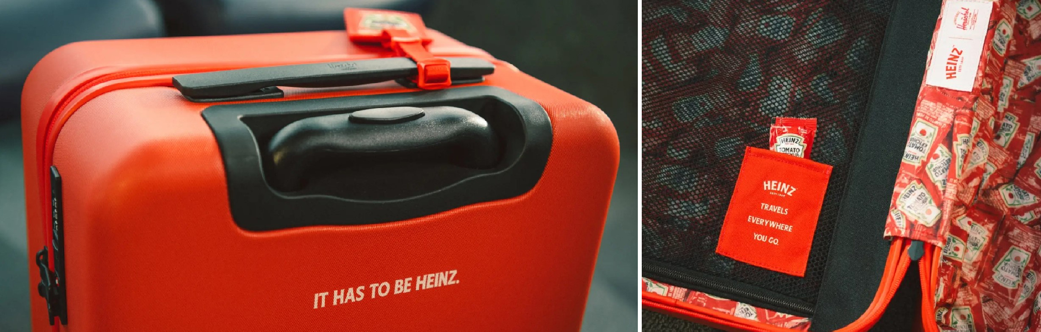 Производитель соусов Heinz объединился с канадской компанией Herschel Supply, производящей рюкзаки и аксессуары, для запуска лимитированной коллекции чемоданов. Проект «вдохновлен поклонниками, которые никогда не путешествуют без своего любимого соуса», сообщает Marketing-Interactive.