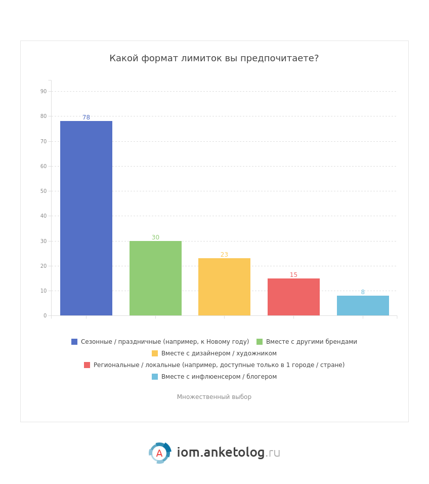 Большинству (78%) опрошенных нравятся сезонные лимитированные товары, например, к Новому году. Почти треть (30%) поддерживают формат, когда бренды объединяются в совместную коллаборацию, а 23% – нравятся дизайнерские лимитки. Региональные или локальные (например, доступные только в одной стране) привлекают 15% опрошенных, а предпочтение лимитированным продуктам в сотрудничестве с инфлюенсерами отдают только 8% респондентов.