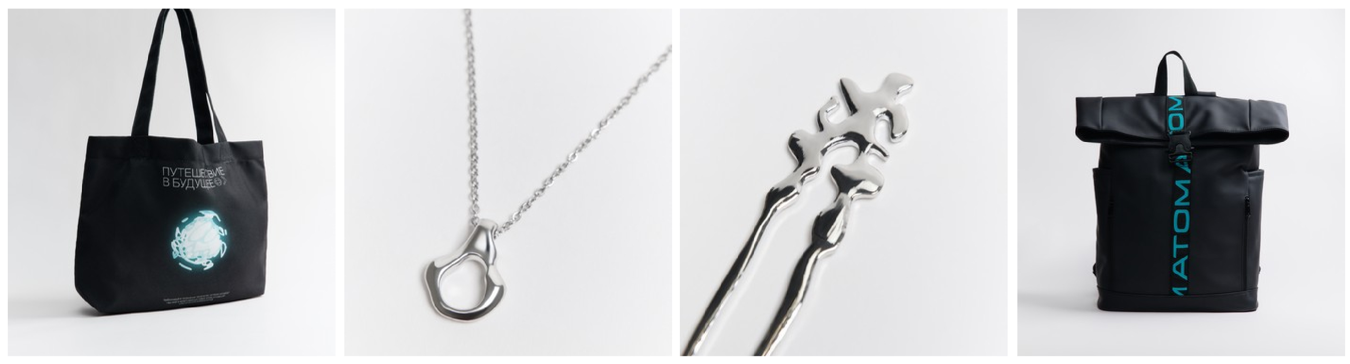 В коллаборации представлены футуристичные дорожные аксессуары – водоотталкивающий рюкзак, шопер, дорожная подушка с капюшоном, «космическая» заколка и подвеска. Коллекцию дополнили футболки с принтами, среди которых цитата Циолковского «Невозможное сегодня станет возможным завтра» и принт эффекта Вавилова-Черенкова – свет, который рождается от скорости.