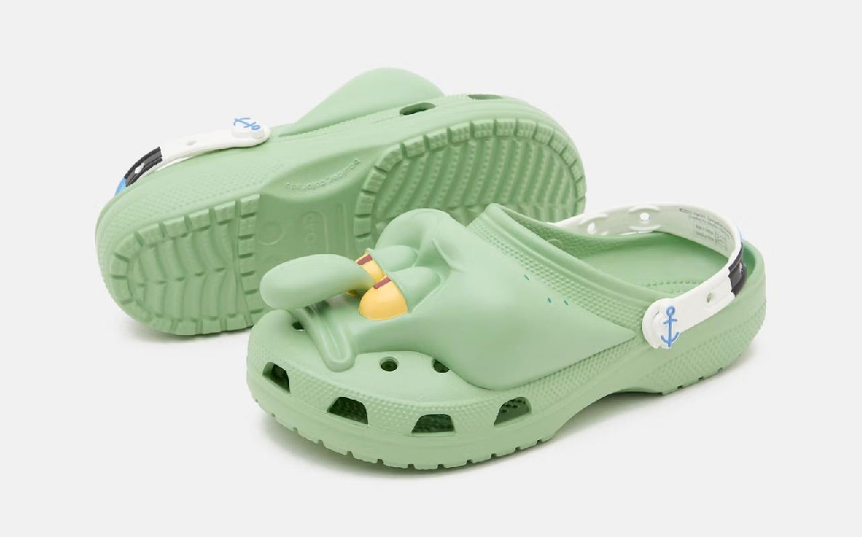 Компания решила не ограничиваться обычными джибитсами и разместила на тапках недовольное лицо персонажа. При этом задний ремешок будет выполнен в стиле рабочей кепки Сквидварда.