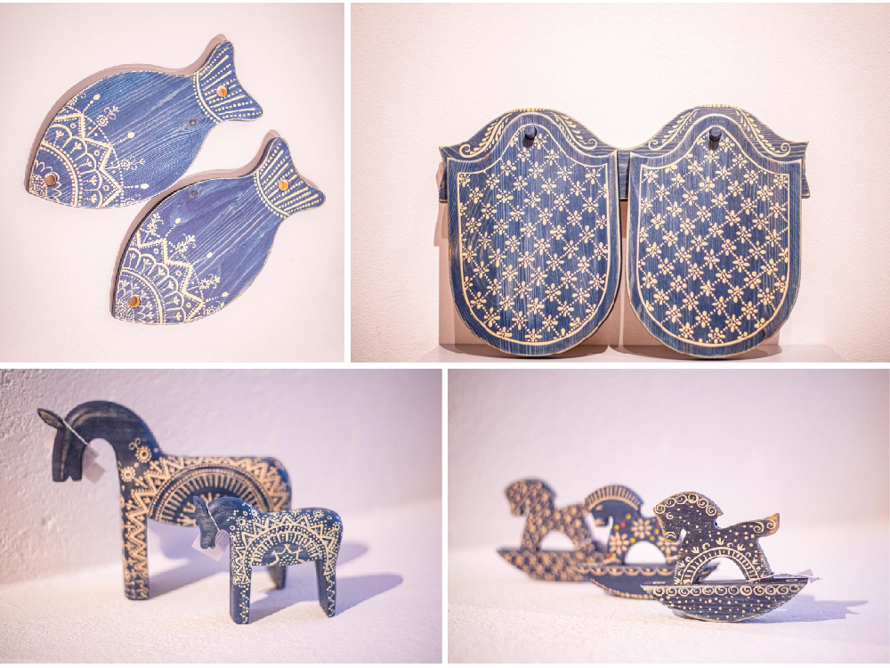 Характерный темно-синий цвет и техника кубовой набойки перенесен на деревянные предметы. Они оживляют старинные мотивы в современном исполнении.