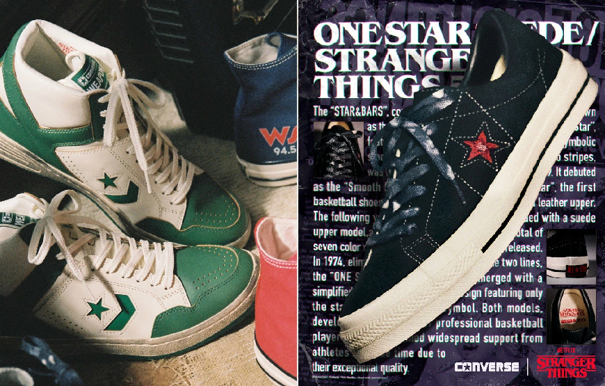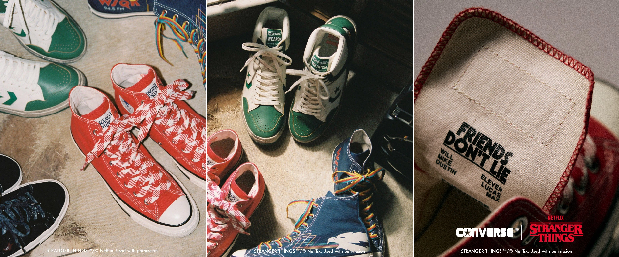 В линию вошли три классические модели Converse. Пара Chuck Taylor All Star выполнена в красном, черном, зеленом, персиковом, сером и темно-синем с принтованными шнурками. На язычке кед с внешней стороны размещен логотип Stranger Things, а с внутренней — надписьn Friends don't lie и имена культовых персонажей, которые всегда произносили эту фразу в сериале. Темно-синяя версия отличается изображением, отсылающим к вымышленной радиостанции WSQk The Squawk из шоу.