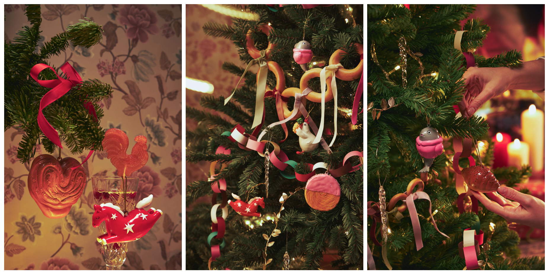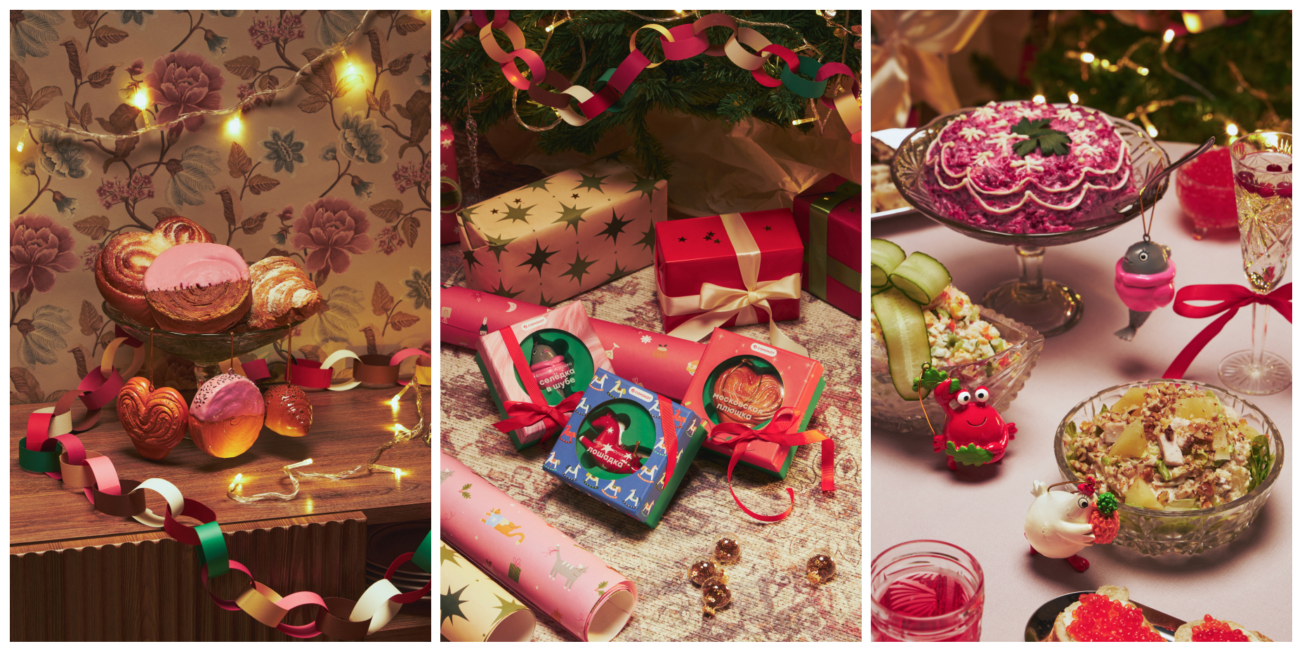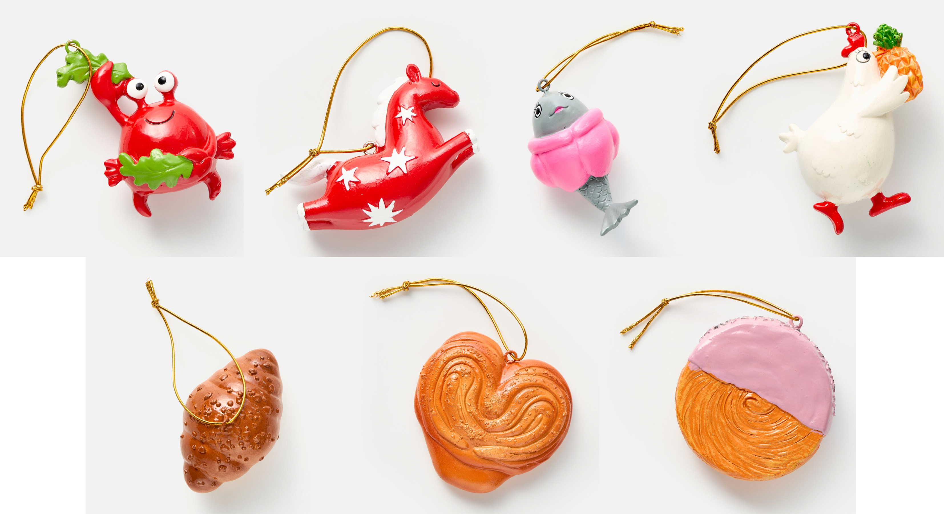 В лимитированную коллекцию вошли елочные игрушки в виде круассана, коина, московской плюшки, краба с листом салата, курицы с ананасом в крыле и селедки, укутанной в розовую шубу, а также символ наступающего года – красная лошадь. Все игрушки раскрашены вручную.