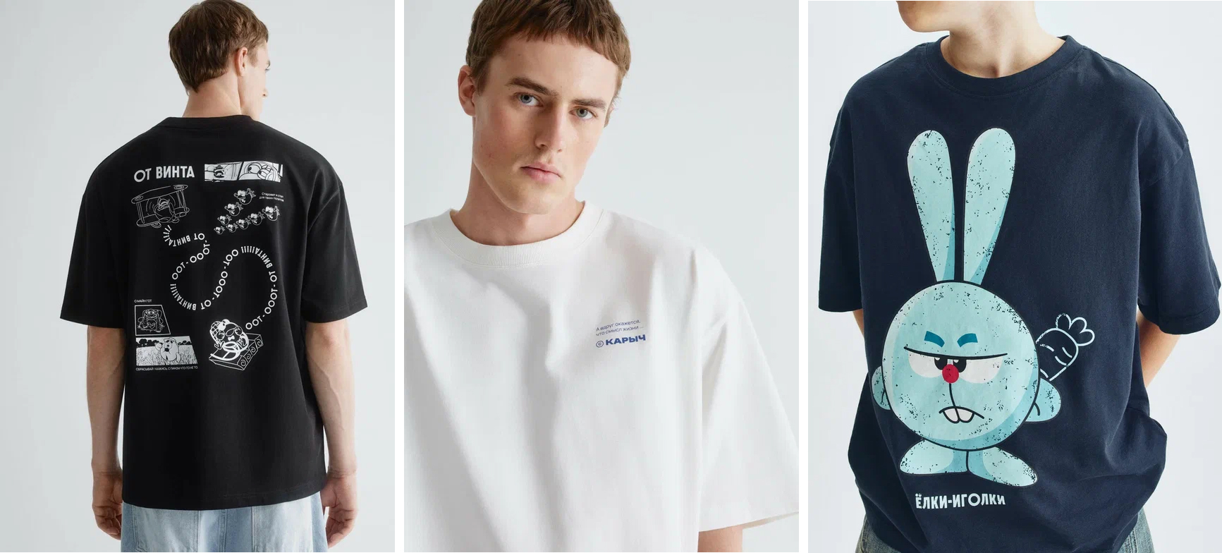 Мужская капсула представлена шестью цветомоделями футболок оверсайз с акцентными и ироничными принтами, которые легко вписываются в базовый гардероб.