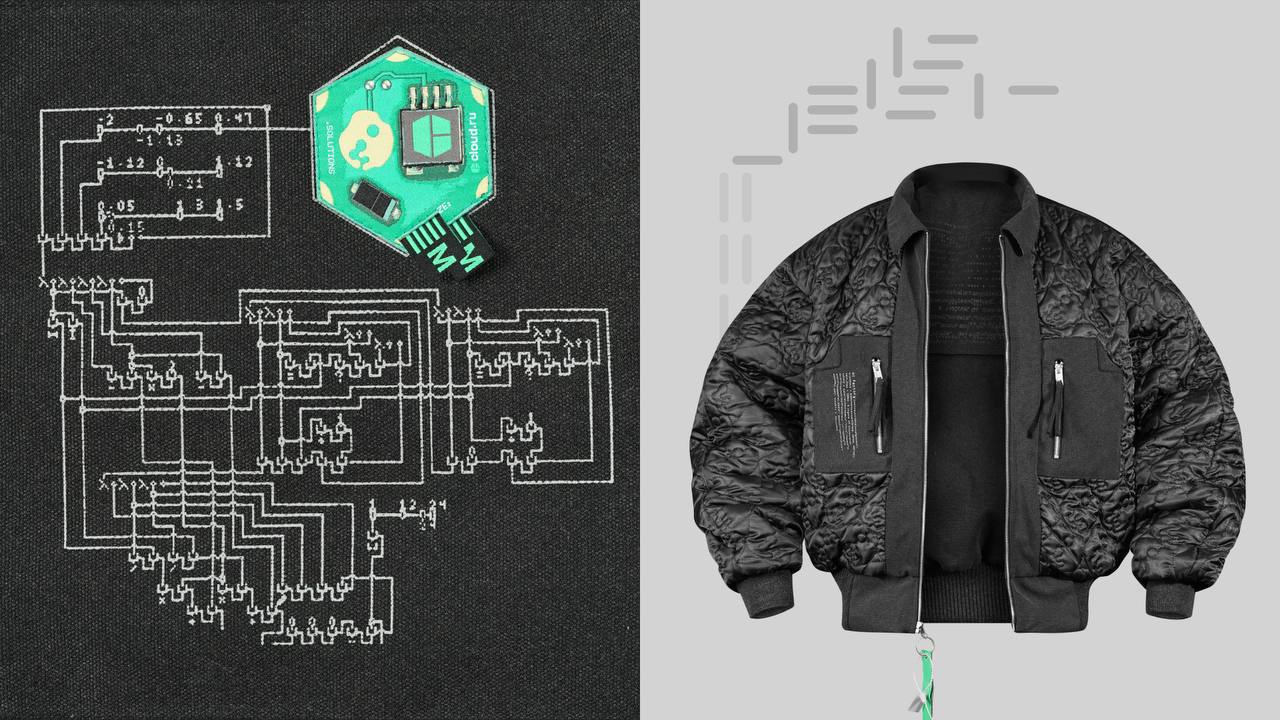 В каждом предмете зашифрованы технологические коды и отсылки к AI Factory, например размерные этикетки выполнены в виде материнской платы, а в качестве графики и принтов – строчки кода.