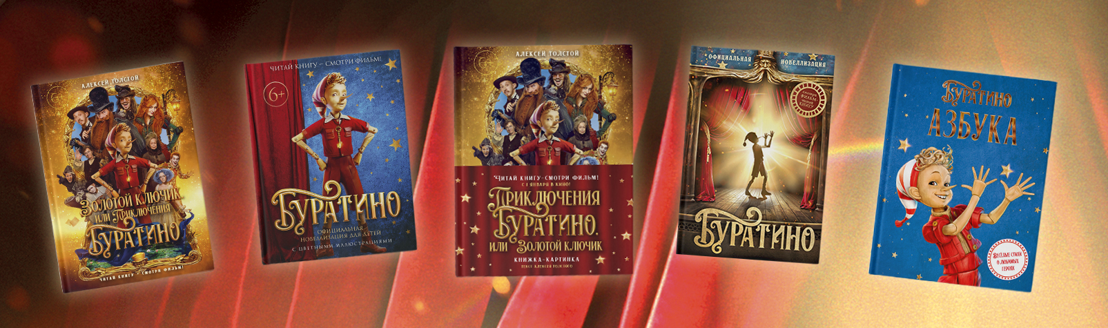Знакомство с историей через яркие иллюстрации серии «Буратино. Книги по фильму» предлагает своим читателям издательство «Махаон». Художественный пересказ фильма лег в основу двух новеллизаций: одна для детей постарше, вторая, с цветными иллюстрациями, – для малышей. По мотивам кинорелиза создана азбука, дневник, активити книги с заданиями, многоразовые тетради «пиши-стирай», а также детская энциклопедия и спин-офф сюжета про приключения Буратино в период гастролей театра Карабаса.