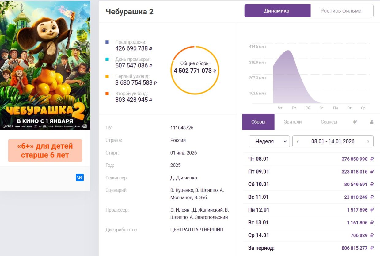 9 января сборы фильма «Чебурашка 2» достигли 4,5 млрд рублей. Такого результата картина добилась на девятый день проката – премьера ленты состоялась 1 января. Сиквел остается безусловным лидером кинотеатральных чартов, обгоняя «Простоквашино» и «Буратино».