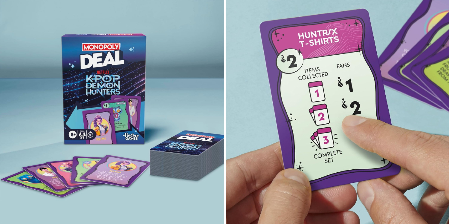 Теперь в продаже появилась The Monopoly Deal: Kpop Demon Hunters Card Game, основанная на мультфильме. Ход игры напоминает классическую «Монополию» – участникам тоже нужно собрать полный набор карт. По сюжету необходимо получить предметы для Руми, Миры и Зои, чтобы девушки провели успешный концерт. По словам создателей, игра подходит для всех возрастов. Комплект вышел 1 января и мгновенно стал бестселлером: Amazon продали более 8000 коробочек в первую неделю. Один набор обойдется в 12,99 долларов.