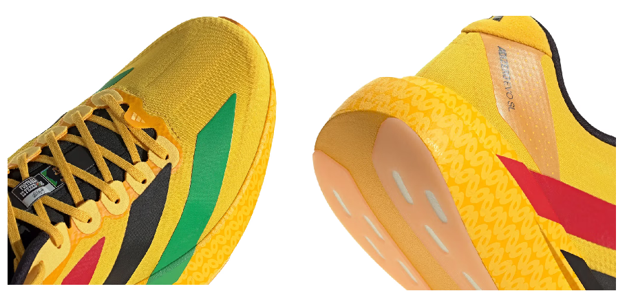 Кроссовки выполнены из дышащего сетчатого материала насыщенного желтого цвета. Фирменные три полоски сбоку оформлены в красном, черном и зеленом цвете. Они отсылают к ямайским корням Боба. Также на язычке модели размещены портрет музыканта, его подпись и цитата «Футбол есть свобода» – намек на страсть Марли к этому виду спорта.