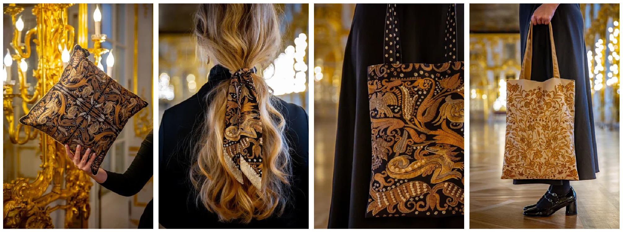 Принты созданы на основе двух исторических предметов из коллекции музея. Первый – перчатки сокольничего с крагами из черного бархата с орнаментом из позолоченной нити и жемчуга, по краю обшиты посеребренной бахромой. Второй – фрагмент шлейфа придворного платья из белого муара, богато украшенного объемным золотым шитьем. Платье было частью приданого великой княжны Ксении Александровны, сестры императора Николая II.