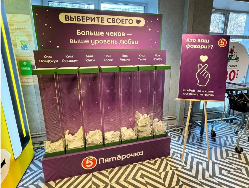 К возвращению BTS подключилась и сеть «Пятерочка». В магазинах установили стойки для голосования за любимого участника группы: покупатели опускают чек в контейнер с именем айдола, а всю собранную бумагу потом отправляют на переработку.