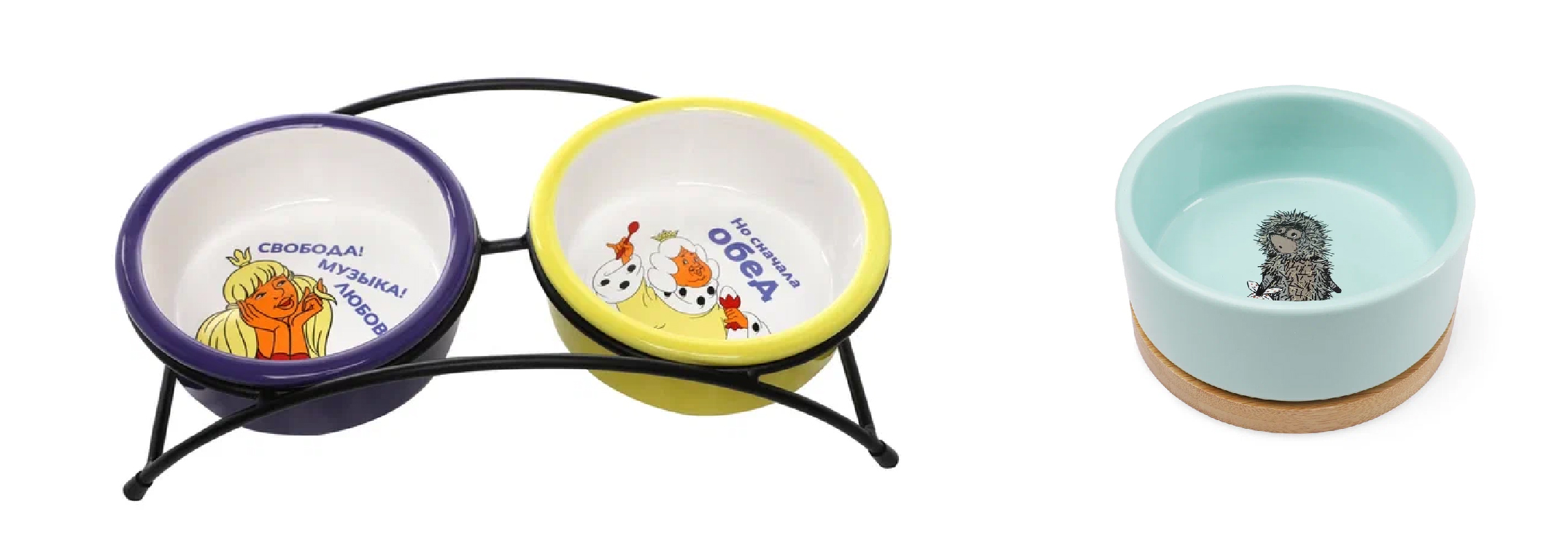 Коллекция дополняется практичными решениями для кормления. Двойные керамические миски на устойчивой подставке просты в уходе и идеально подходят активным любимцам.