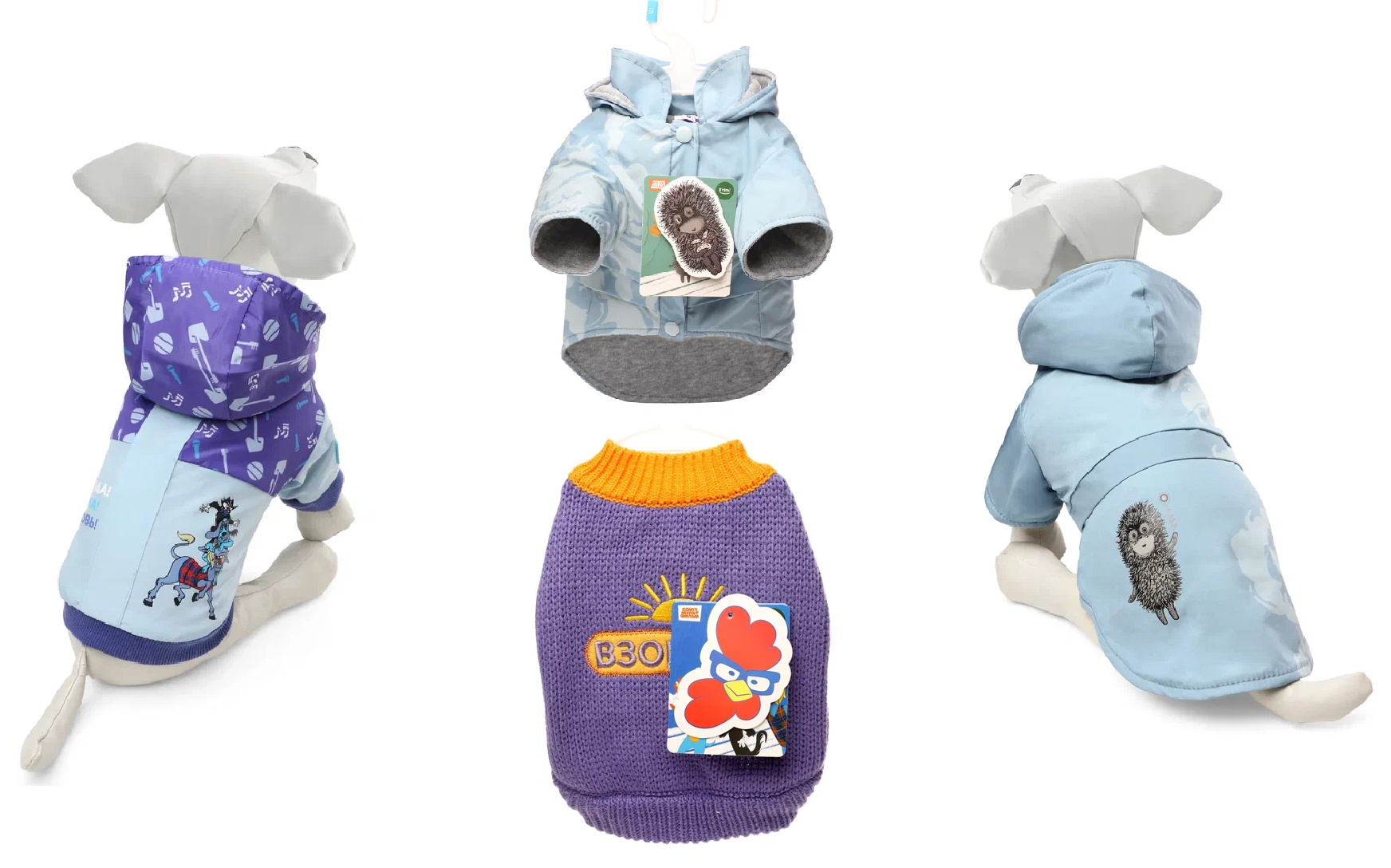 Совсем другое ощущение создает коллекция «Ежик в тумане». Она встречает приглушенной палитрой серо-голубых тонов, которая подчеркивает задумчивый и уютный характер знаменитого героя. Он появился на толстовках с карманами и на дождевиках с капюшонами, выполненных из приятного на ощупь и легкого материала. Каждый предмет дарит тепло, защищает от ветра и позволяет любимцу чувствовать себя комфортно, не ограничивая движения.