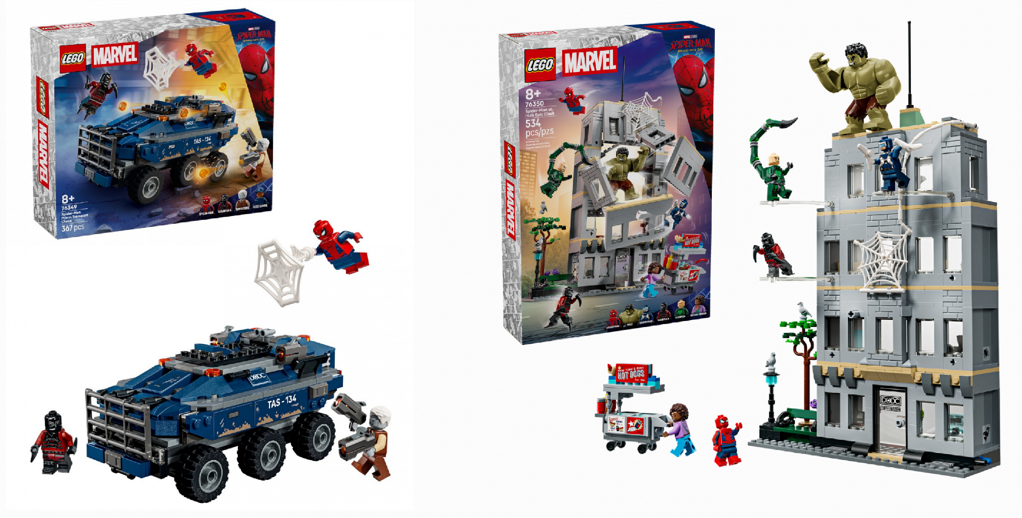 Комплект «Погоня за тюремным транспортом Человека-паука» включает в себя минифигурки Питера Паркера, Тарантула, Могильщика и охранника Департамента по контролю за разрушениями. По итогу должна получиться большая тюремная машина. Цена набора – 49,99 долларов. «Эпическая битва Человека-паука против Халка» стоимостью 89,99 долларов представляет собой четырехэтажное здание. Внутри: фигурки Человека-паука, Халка, Скорпиона, Тарантула, Бумеранга и даже продавца хот-догов.