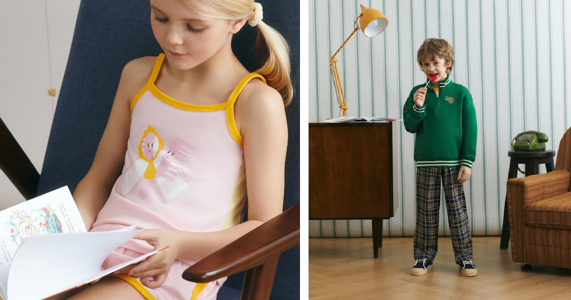 Модели выполнены в ретро-стилистике: пижамы и футболки с контрастными окантовками, яркие оверсайз-бомберы и свитшоты с принтами, напоминающими иллюстрации из детских книг. Изделия поставляются в коробке, стилизованной под книгу сказок, а этикетка выполнена в виде закладки – ее можно использовать для чтения.